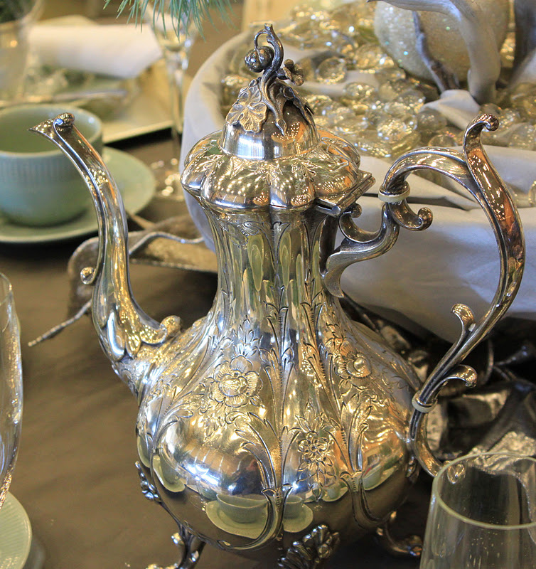 The greatest silver coffee pot I have ever seen. Diva Stylist told me that she and her husband have been married for 40 years, and when first married everyone "had to have a silver tea service." So on their one year anniversary, they went to Robinsons and found this service. They decided to buy one piece, and then buy another piece for each anniversary. The saleswoman told them that "that would not do because then the pieces wouldn't match." Their first credit purchase as a young couple was this FABULOUS service. Maybe not the best choice then, but what a treasure to have had for 40 years!